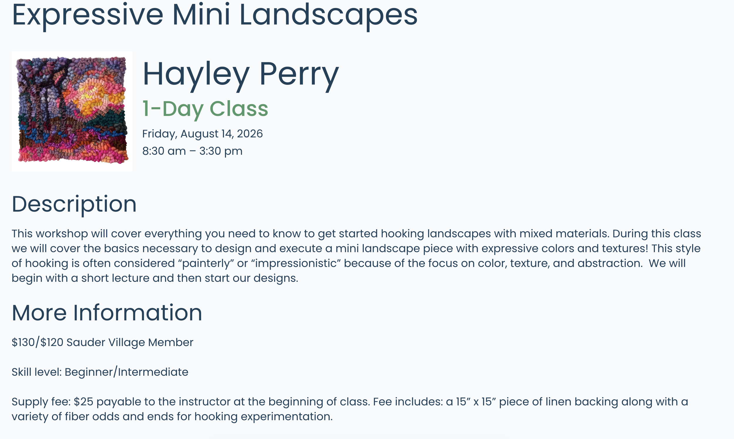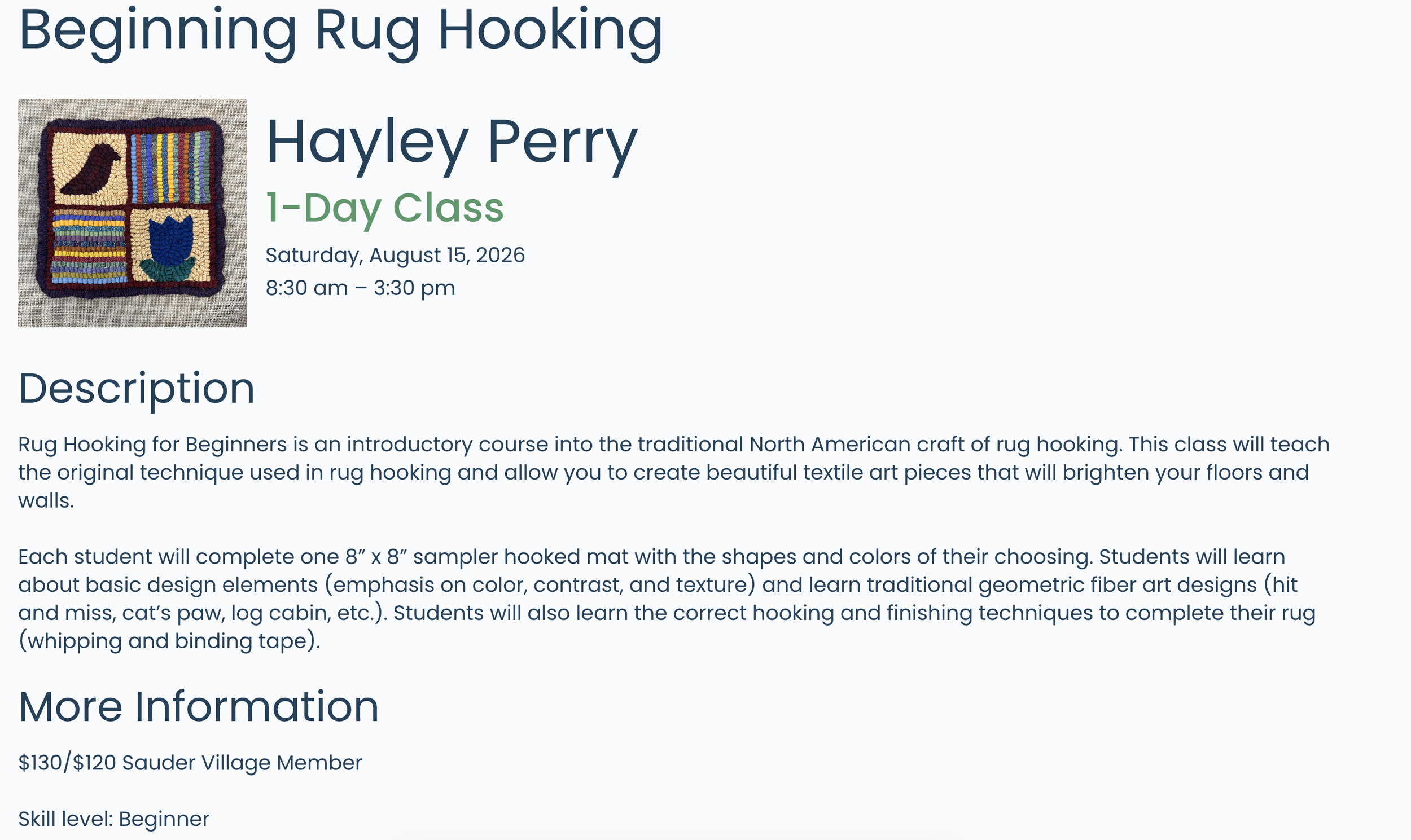 I will be teaching two workshops at Sauder Village’s Rug Hooking Week in Archibold, OH this year! Click here for more information on Rug Hooking Week!